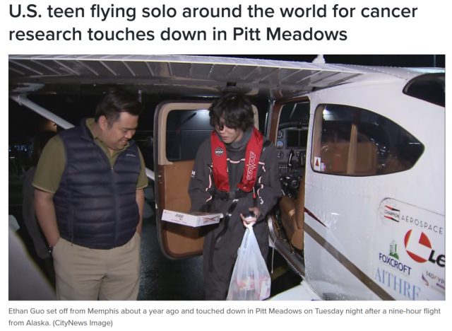据加西周末综合报道:19岁的华裔美国青年郭伊森(Ethan Guo)正在进行一项史无前例的壮举——驾驶小型飞机独自飞越世界七大洲,为儿童癌症研究筹集100万美元善款。
