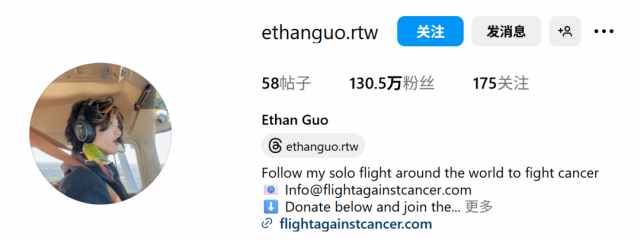截至目前,郭伊森已经为他的“抗癌飞行”筹集了超过10.5万美元。他在Instagram上拥有130万粉丝,一直在记录自己的旅程。