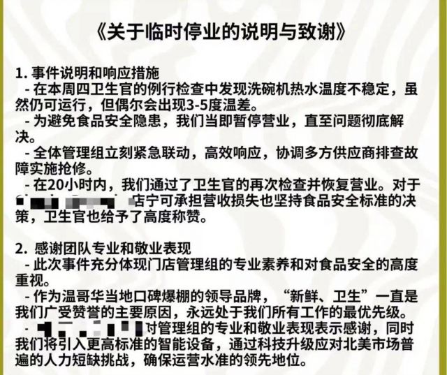 声明中表示,门店之所以被责令停业,是因为洗碗机水温不稳定,虽仍能运作,但未达到规定的卫生标准。