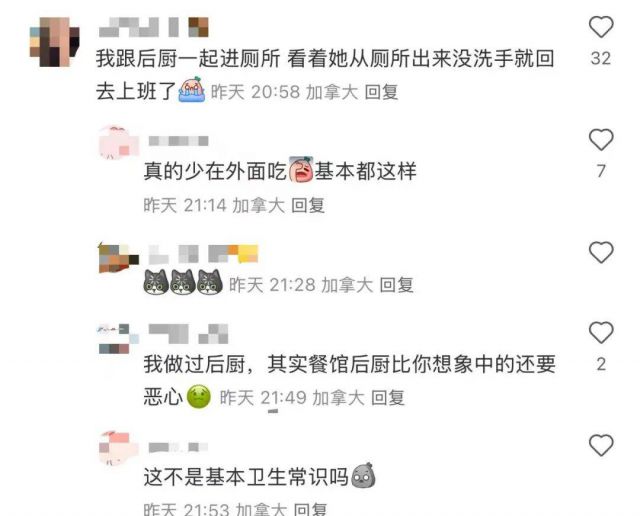 网友A表示:“我之前在他家,和后厨一起进厕所,眼看着她出来没洗手,就回去上班。”