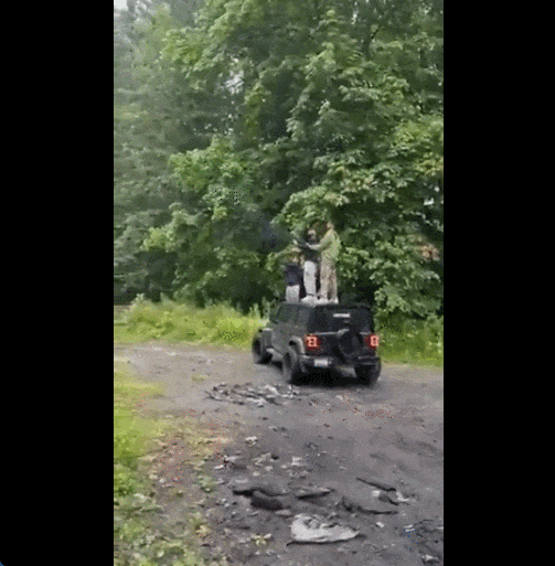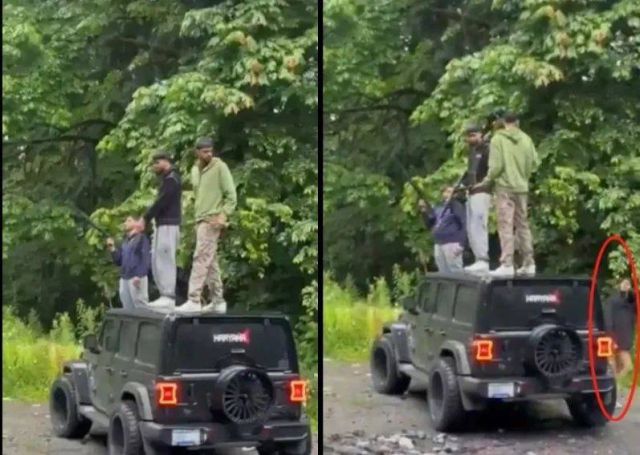 画面中,三名印度小哥站在一辆SUV的车顶,手持真枪,朝着树林方向连连开火,子弹四处飞溅,弹壳落得满地都是!