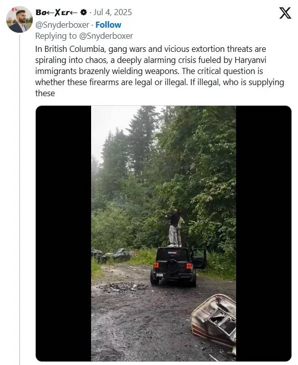 曝光这段视频的网友写道:“这段令人不安的视频拍摄于卑诗省的某个地方,画面显示三名来自哈里亚纳邦的印度人在森林里肆意地开枪射击。