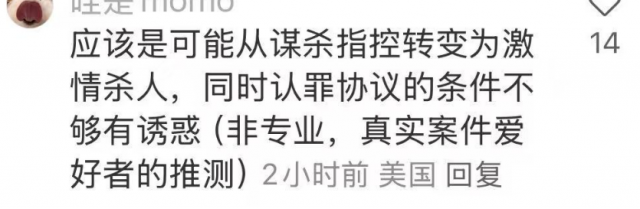 网友@空空在谈判表示,是否认罪,取决于检察官提出了什么罪名。具体到本案,如果检察官的指控为“一级谋杀”,而被告认为自己的罪名不应该这么严重,就会表示不认罪。