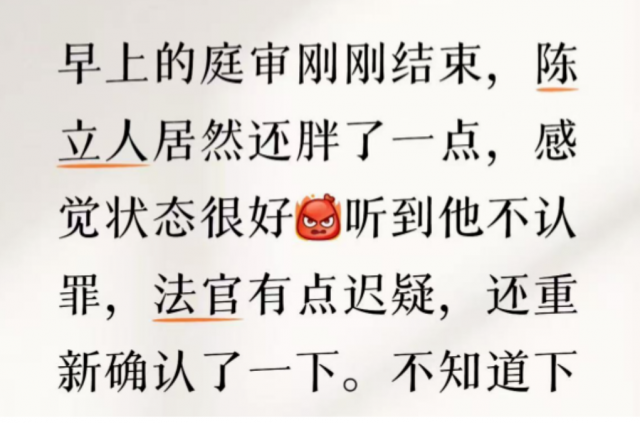 不少参与庭审的网友表示,陈立人当天出庭时身穿红色囚服,坐在角落里,看起来精神很好,和之前相比明显变胖了。