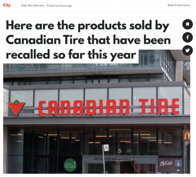 加拿大卫生部发布了警报,并提供了有关在加拿大轮胎商店和其他零售商处销售的这些产品的主动召回的进一步详细信息。虽然其中一些召回是近期发生的,但有些产品早在2018年和2019年就在加拿大销售。今年召回的商品包括儿童玩具、吹雪机和女靴。