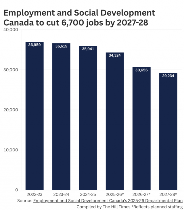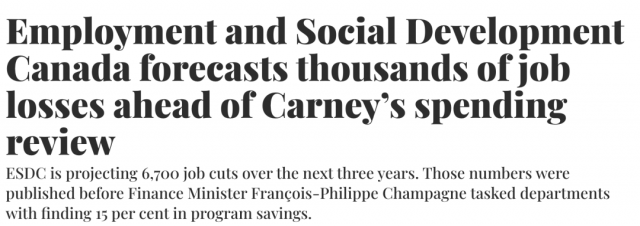 最新发布的《部门规划》明确指出:未来三年内,联邦政府计划从就业与社会发展部(ESDC)削减约 6,707 个岗位,占其现有人员的 18% 以上。截至2025年3月底,ESDC 总岗位为 35,941 个,预计到 2027‑28 财年将下降至 29,234 个。