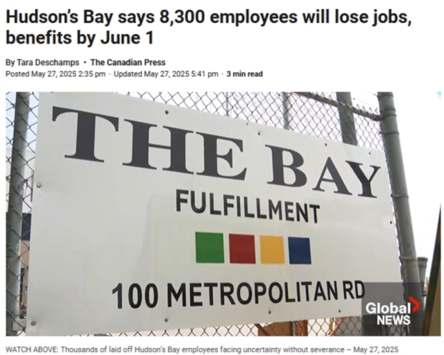 加拿大国民百货Hudson’s Bay的倒闭,截至6月1日清算日期已经导致 8340人失业。