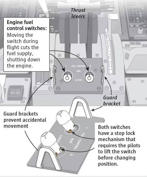 更令人震惊的是,这两个燃油开关位于飞行员座位之间、节流阀后方。