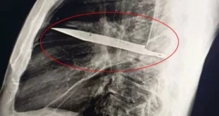 据加西周末综合报道:一名44岁男性因右乳下方流脓而前往坦桑尼亚医院就诊,却意外发现胸腔内竟然插着一把大刀,而且已经存在了整整8年时间! 这位不愿透露姓名的患者最初只是抱怨右乳头下方有脓性分泌物渗出,但没有其他任何症状。他 …